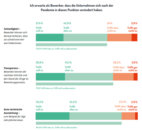Die Coronakrise hat auch die Digitalisierung im HR verstärkt. Ein Großteil der Bewerber (62,6 Prozent) und HR-Verantwortlichen (56,4 Prozent) stimmte der Aussage zu, dass durch die Coronakrise Bewerbungsprozesse digitaler geworden sind. Zudem erwarten drei Viertel der Bewerber eine digitale Fitness von Unternehmen hinsichtlich der Bewerbungsprozesse. Insbesondere die richtige technische Ausstattung und digitalgerechte Prozesse sind den Befragten sehr wichtig. Aber auch eine Transparenz und gute Kommunikation der nächsten Schritte des Bewerbungsprozesses ist für Bewerber essentiell. Zudem erwarten potenzielle Kandidaten eine schnelle Antwort, wenn sie Fragen zu ihrer Bewerbung haben.