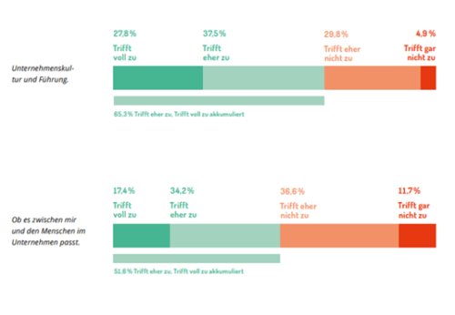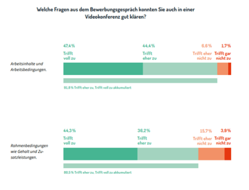 Faktenorientierte Themen wie Arbeitsinhalte und Rahmenbedingungen waren einfach zu beantworten. Hingegen war es schwer durch virtuelle Jobinterviews herauszufinden, ob der Kandidat zur Unternehmenskultur und ins Team passt. Hierbei gaben 11,7 Prozent der Befragten an, dass sie überhaupt nicht durch ein virtuelles Jobinterview feststellen konnten, ob sie zu den Menschen in dem jeweiligen Unternehmen passen. Weitere 36,6 Prozent zeigten sich skeptisch bei der Frage, ob ein virtuelles Jobinterview ausreichend war, um festzustellen, inwiefern das jeweilige Unternehmen zu einem selbst passte.