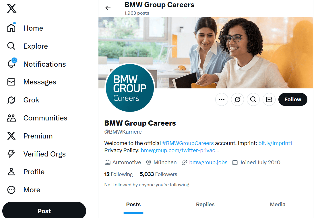 Auf X (ehemals Twitter) erreichen Sie primär Key Opinion Leaders, Journalisten und Public Relation Fachkräfte. X besitzt allein in Deutschland 11,3 Millionen Nutzer, wovon 1,8 Millionen Nutzer wöchentlich aktiv sind. Lassen Sie Ihre Geschäftsführer als Meinungsbildner über Karrieremöglichkeiten in Ihrer Organisation berichten. Oder schalten Sie X Ads, um Ihre Stellenanzeigen auf X zu publizieren. Auf X haben Sie umfangreiche Targeting-Optionen. Dazu gehören Alter, Geschlecht, Keywords und Interessen. Mit X Ads erzielen Sie in kürzester Zeit maximale Reichweite für Ihre Kampagnen und erreichen gezielt alle Interessenten auf X.