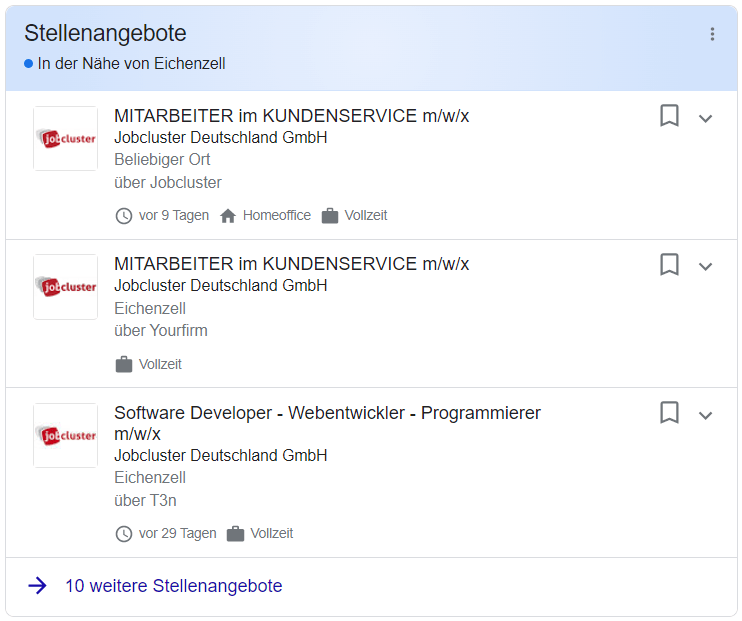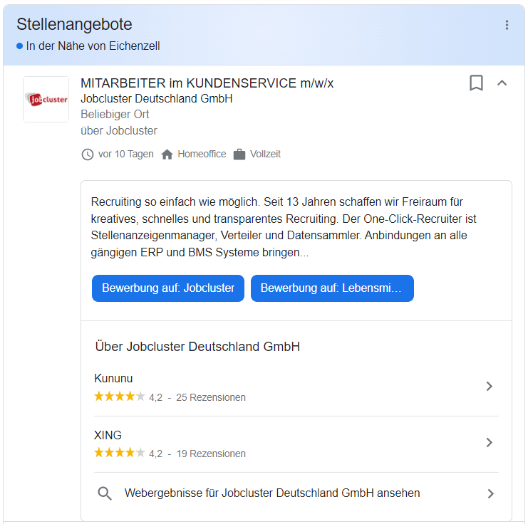 Angezeigt werden die regionalen Suchergebnissen als blauer Balken in der Job-Box der organischen Suche. Klickt ein potenzieller Bewerber auf eines dieser Ergebnisse, so bekommt er einen Vorschautext angezeigt. Mit einem weiteren Klick auf den unteren blauen Pfeil „weitere Stellenangebote“ wird der Bewerber in einen eigenständigen Bereich geführt, der aus Bewerbersicht ähnlich funktioniert wie eine Job-Suchmaschine. Dort kann der Bewerber alle für sich relevanten ansehen und bei Interesse, dass jeweilige Jobangebot auswählen. Im Anschluss erfolgt die Weiterleitung auf die jeweilige Karriereseite, mit den entsprechenden Bewerbungsoptionen.