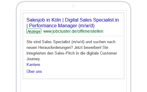 Hier bietet Ihnen Jobcluster mit dem One-Click-Recruiter die Möglichkeit, Stellenanzeigen mit nur einem Klick bei Google Ads zu schalten. Sie profitieren nicht nur durch die schnelle und einfache Schaltung bei Google, sondern auch durch unsere jahrelange Expertise. Neben bei besteht für Sie noch die Option unsere Karriereportal-Lösung in den Karrierebereich Ihrer Unternehmenswebsite zu integrieren. Die Stellenanzeigen-URL auf ihre eigene Domain umgeschrieben, was wiederum positive Auswirkungen auf Ihre Google-Ads Kampagne hat. Dadurch erzielen Sie echte Wettbewerbsvorteile im Vergleich zu generischen Kampagnen über Jobbörsen. Google erkennt den Kontext der Firmenwebsite und bewertet diesen aus Nutzerblick besser, als der reine Link zu Stepstone und Co.