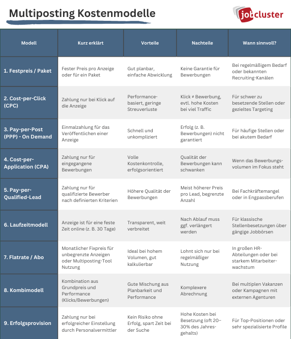 Abhängig vom gewählten Anbieter variieren die Kosten für Multiposting je nach Preismodell. In der folgenden Tabelle sind die unterschiedlichen Kostenmodelle für Multiposting übersichtlich dargestellt.