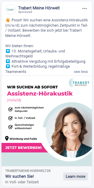 Ein bedeutender Vorteil liegt darin, dass Social Media es Ihnen ermöglicht, auch latente Wechselkandidaten zu erreichen. Diese Mitarbeiter denken derzeit möglicherweise nicht aktiv über einen Jobwechsel nach, sind jedoch offen für neue berufliche Möglichkeiten, wenn sie überzeugende Angebote sehen. Diese attraktiven Stellenangebote werden den Kandidaten in Form von Werbeanzeigen präsentiert, während sie durch ihren Newsfeed auf den Plattformen scrollen. Auf diese Weise schaffen Sie mehrere Interaktionspunkte, die qualifizierte Talente immer wieder auf Ihre spannenden Karrieremöglichkeiten hinweisen. Besonders im Hinblick auf hochqualifizierte Fachkräfte, die bereits in einer festen Position sind und nicht aktiv Jobs suchen, gewinnt dieser Ansatz zunehmend an Bedeutung.