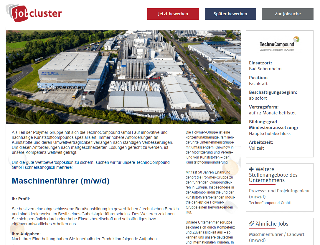 “Die persönliche Kundenbetreuung ist nicht nur schnell, sondern auch sehr professionell und bringt individuelle Vorschläge ein. Das ist bei webbasierten HR-Programmen nicht selbstverständlich. Jobcluster ist eine echte Unterstützung und aus unserer täglichen Arbeit nicht mehr wegzudenken!”