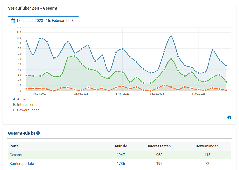 Unser Statistik-Modul bietet Ihnen zwei verschiedene Ansichten. Sie können entweder einzelne Stellenanzeigen miteinander vergleichen oder eine kumulierte Ansicht aller Stellenanzeigen Ihres Nutzerkontos einsehen.