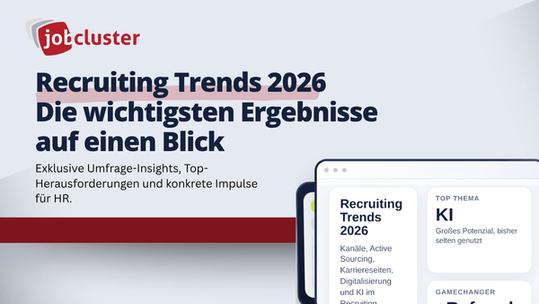 wir freuen uns, Ihnen die Jobcluster Recruiting Trends 2026 Umfrage präsentieren zu können! Bereits im zweiten Jahr in Folge bieten wir Ihnen einen umfassenden Report zu den aktuellen Trends und Herausforderungen im Recruiting. Zusätzlich stellen wir Ihnen in diesem Jahr Vergleichsdaten aus der Erhebung des Vorjahres zur Verfügung. Die Jobcluster Recruiting Trends 2026 basieren auf einer Umfrage, die von Oktober 2025 bis Anfang Februar 2026 durchgeführt wurde.