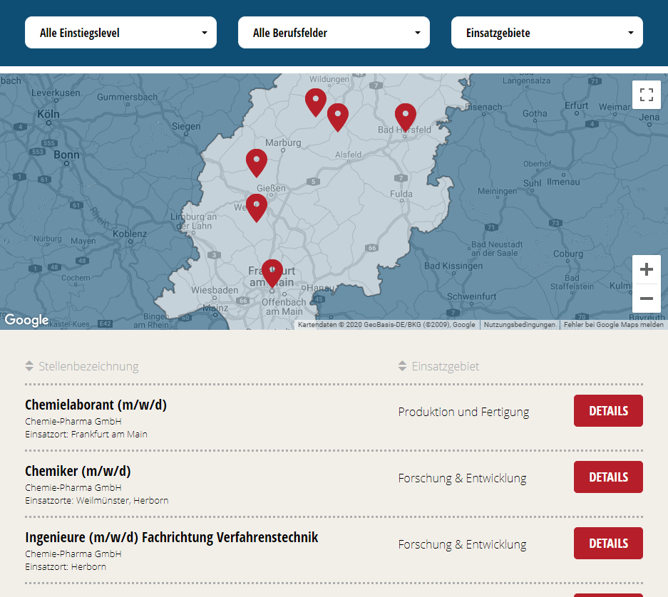 Das Karriereportal wird als „iframe-Plug-in“ zur Verfügung gestellt. Dieses gewährleistet die Veröffentlichung der aktuellen Stellenangebote aus den niederlassungs- oder den gesellschaftsspezifischen Kundenaccounts auf dem Karriereportal der Unternehmenswebsite. Durch entsprechende Parametrisierungen des Karriereportals wird eine Filterung auf spezifische Jobangebote der unterschiedlichen regionalen Niederlassungen oder Gesellschaften garantiert.