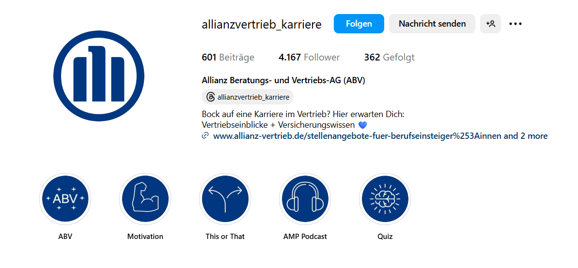 Instagram Unternehmensprofil von Allianz Vertrieb für das Recruiting