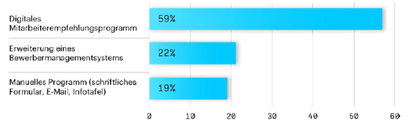 Primär werden Mitarbeiter-werben-Mitarbeiter-Programme via Intranet oder durch die direkte Kommunikation von Führungskräften kommuniziert. Generell zeigt sich, dass digitale Kanäle (z. B. Internet, Newsletter, Apps) immer wichtiger werden, um Mitarbeiterempfehlungsprogramme in der eigenen Organisation erfolgreich zu kommunizieren.