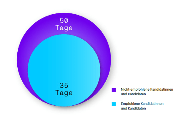 Mitarbeiterempfehlungsprogramme bieten einen weiteren Vorteil: Sie verkürzen die Zeit bis zur Einstellung (Time-To-Hire). Empfohlene Kandidaten werden im Durchschnitt nach 35 Tagen eingestellt – im Gegensatz zu nicht empfohlenen Kandidaten, welche erst nach 50 Tagen eingestellt werden.