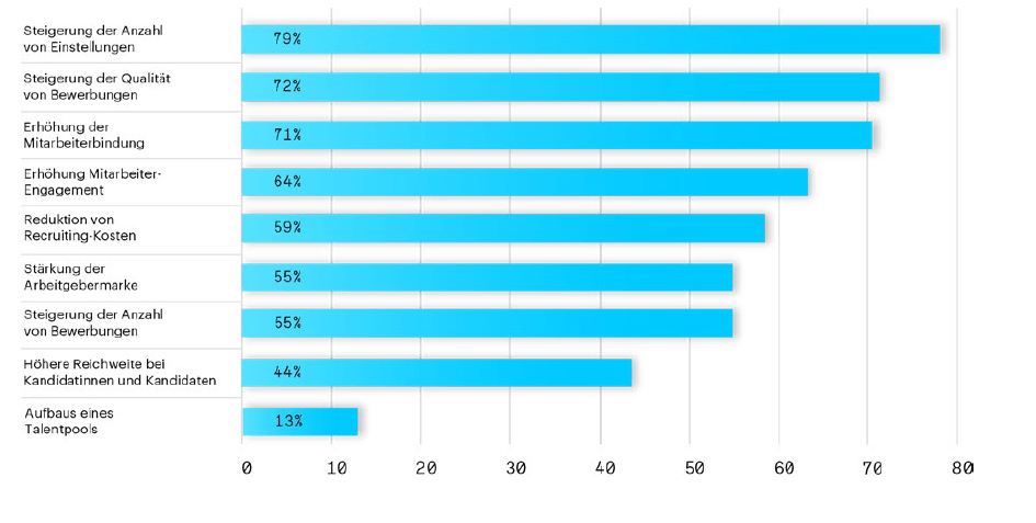 Die befragten Personaler gaben an, primär Mitarbeiterempfehlungsprogramme zu nutzen, um die Quantität und Qualität der Bewerbungen zu erhöhen. Darüber hinaus waren weitere wichtige Ziele von Mitarbeiter-werben-Mitarbeiter-Programmen: Das Mitarbeiter-Engagement zu erhöhen, Recruiting-Kosten zu reduzieren und die eigene Arbeitgebermarke zu stärken.
