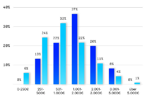 Die Mehrheit der Organisationen im DACH-Raum zahlt Geldprämien in Höhe von 501 bis 1000 Euro (siehe hellblaue Balken). Generell bieten internationale Organisationen höhere Prämien für Mitarbeiterempfehlungen als Organisationen aus dem DACH-Raum (siehe dunkelblaue Balken).