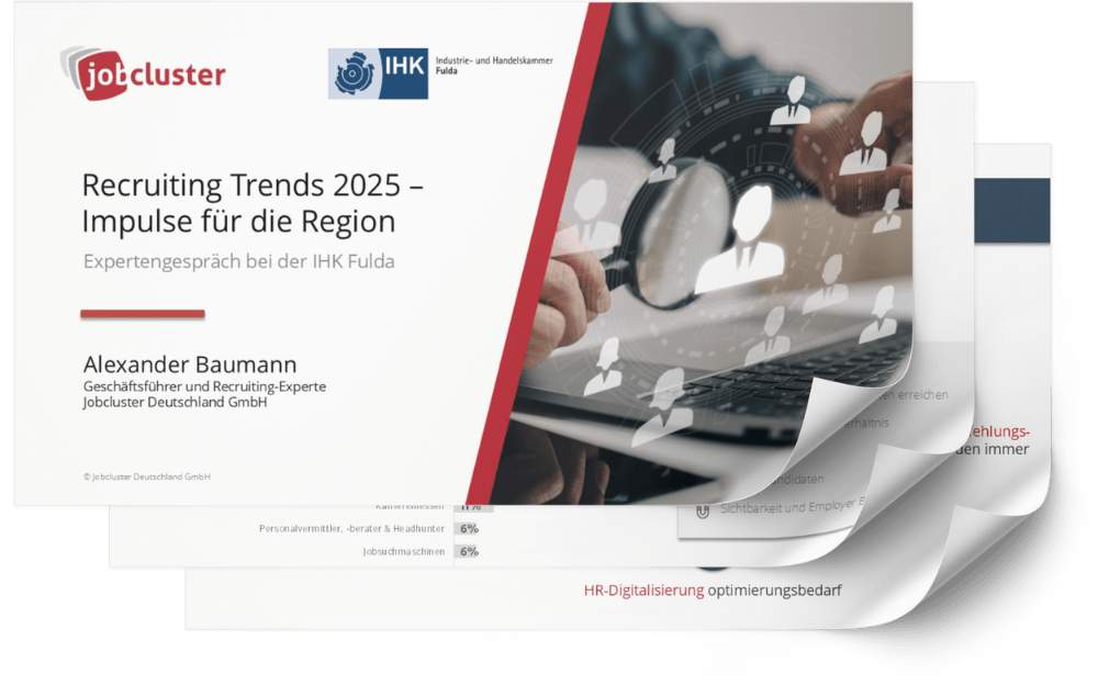 Unsere aktuelle Umfrage 2025 zeigt: Social Media und digitale Tools gewinnen an Bedeutung. Gleichzeitig stehen viele Unternehmen in Sachen Digitalisierung vor großen Herausforderungen – insbesondere im Recruiting. Antworten und praxistaugliche Lösungen geben Ihnen Alexander Baumann, Recruiting-Experte und Geschäftsführer von Jobcluster, und Sven Hinterschuster, Senior Online Marketing Manager bei Jobcluster.