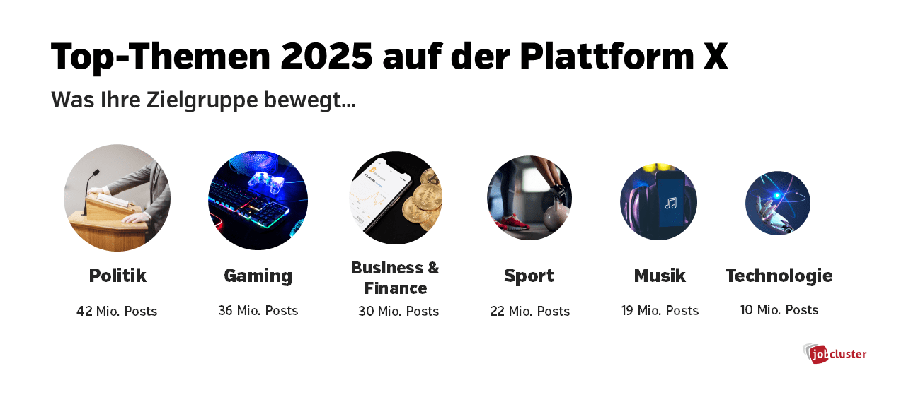 Auf X werden eine Vielzahl von Themen intensiv diskutiert und die Themenvielfalt ist ein wichtiger Faktor, den Sie bei der Gestaltung Ihrer Rekrutierungsstrategie berücksichtigen sollten. Nach Post-Volumen betrachtet ist Politik mit 42 Millionen Posts das dominierende Thema. Dahinter folgen mit 36 Millionen Posts Gaming, 30 Millionen Posts zu Business und Finance, einschließlich Aktien und Krypto, sowie 22 Millionen Posts zu Sport. Musik wird ebenfalls stark diskutiert, mit 19 Millionen Posts, während Tech mit 10 Millionen Posts auch eine wichtige Rolle spielt.