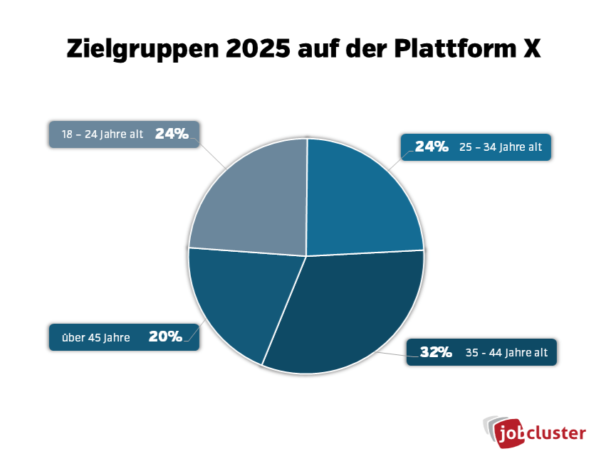 Das X-Publikum ist vielfältig und bietet Ihnen als Recruiter eine breite Zielgruppe, die Sie gezielt für die Rekrutierung von Talenten nutzen können. Etwa 24% der Nutzer sind zwischen 18 und 24 Jahre alt, während ebenfalls 24% der Nutzer im Alter von 25 bis 34 Jahren sind. Rund 20% der Nutzer befinden sich im Alter von 35 bis 44 Jahren und 32% der Nutzer sind über 45 Jahre alt.