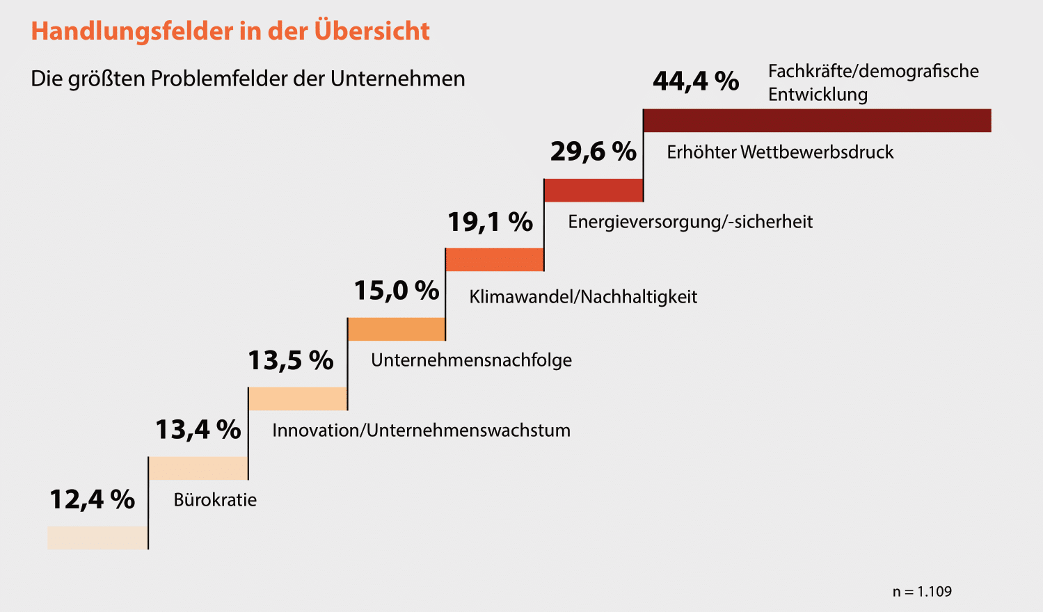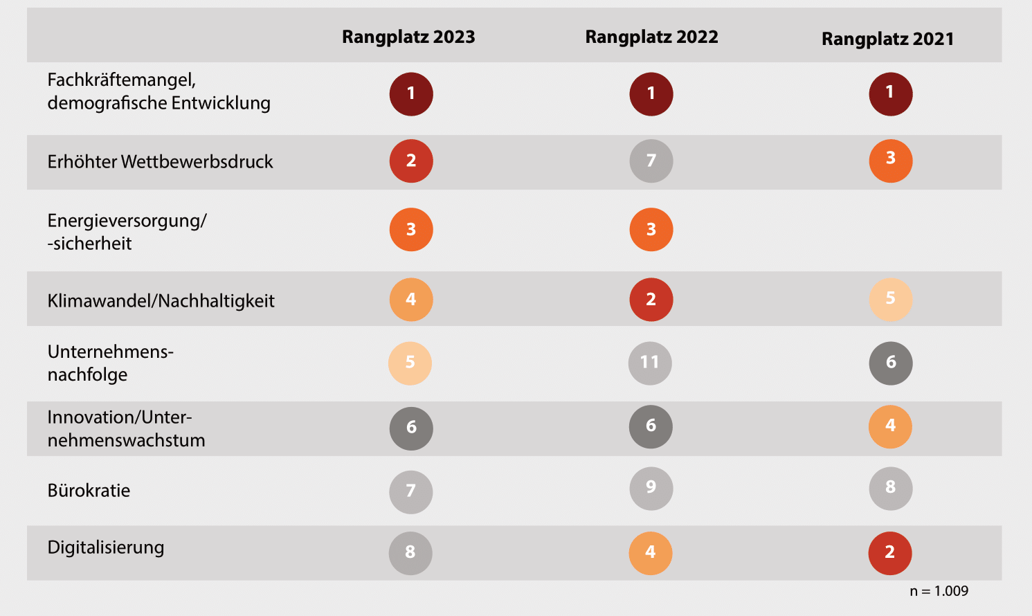 An zweiter Stelle der Problemfelder befindet sich der erhöhte Wettbewerbsdruck unter den deutschen Unternehmen. Ebenso wie das dritte Problemfeld „Energieversorgung“ seien hierfür die gestiegenen Kosten der Auslöser. Diese drei Themen sind im Allgemeinen die Top-Problemfelder, wenn die Unternehmensgrößen außer Betracht gelassen werden. Die Plätze darunter seien eher für international tätige Unternehmen oder solche in einer besonders guten wirtschaftlichen Lage relevant. Diese Themen sind der Klimawandel und der dadurch notwendige Fokus auf Nachhaltigkeit, die Frage nach der Unternehmensnachfolge infolge des Generationswechsels, die Suche nach Innovation infolge des erhöhten Wettbewerbsdrucks und bürokratische Hürden.