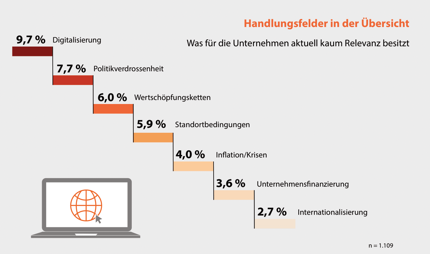 Ergänzend zur Frage eins erweisen sich die unteren Plätze der Umfrage als aktuell weniger relevant für die deutschen Unternehmen. Das Thema Digitalisierung liegt somit noch knapp unter den bürokratischen Hürden. Die unteren Plätze weisen laut der Studie darauf hin, dass die deutschen Unternehmen derzeit vorrangig auf tagesaktuelle Herausforderungen reagieren. So seien für die Unternehmen weniger akute Problemfelder, wie Krisen, Inflation und der Ukrainekrieg, von geringerer Relevanz. Auch die Folgen der Corona-Pandemie verlieren an Bedeutung.