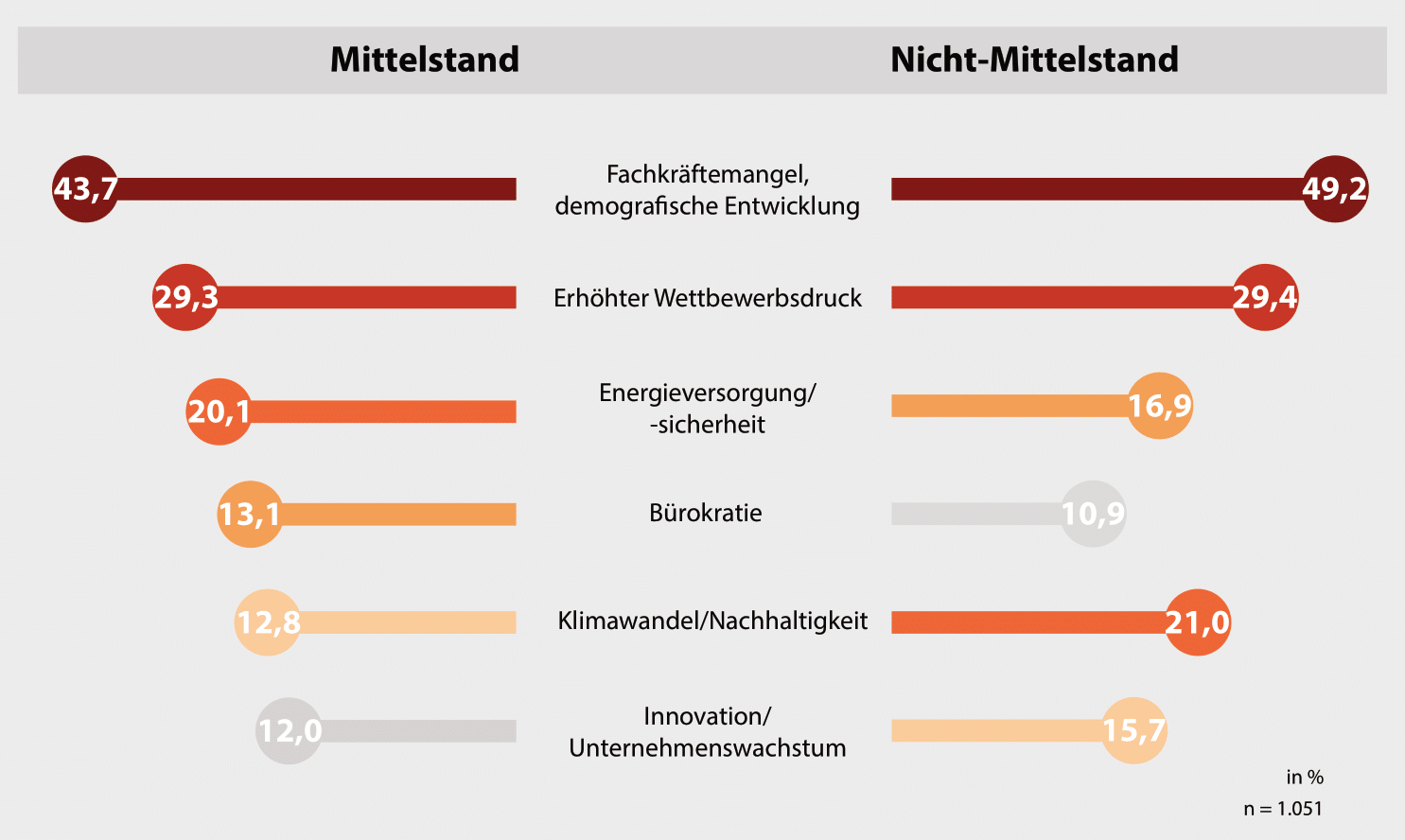Die Studienergebnisse des Zukunftspanel Mittelstand bieten Einblicke in die allgemeine Stimmung der mittelständischen als auch nicht-mittelständischen deutschen Unternehmen. Im Vergleich zu den Ranglisten-Ergebnissen 2022 kommen im Jahr 2023 neue Themen in die Top-Plätze. Dazu gehören die Unternehmensnachfolge aufgrund des Top-Themas demografischer Wandel sowie der erhöhte Wettbewerbsdruck aufgrund von steigenden Produktionskosten. Die Studie zeigt zudem Prioritätsunterschiede je nach Unternehmensgröße. So spielen die bürokratischen Hürden eine größere Relevanz für mittelständische Unternehmen und nehmen somit einen höheren Stellenwert an als das Thema „Innovation und Unternehmenswachstum“.