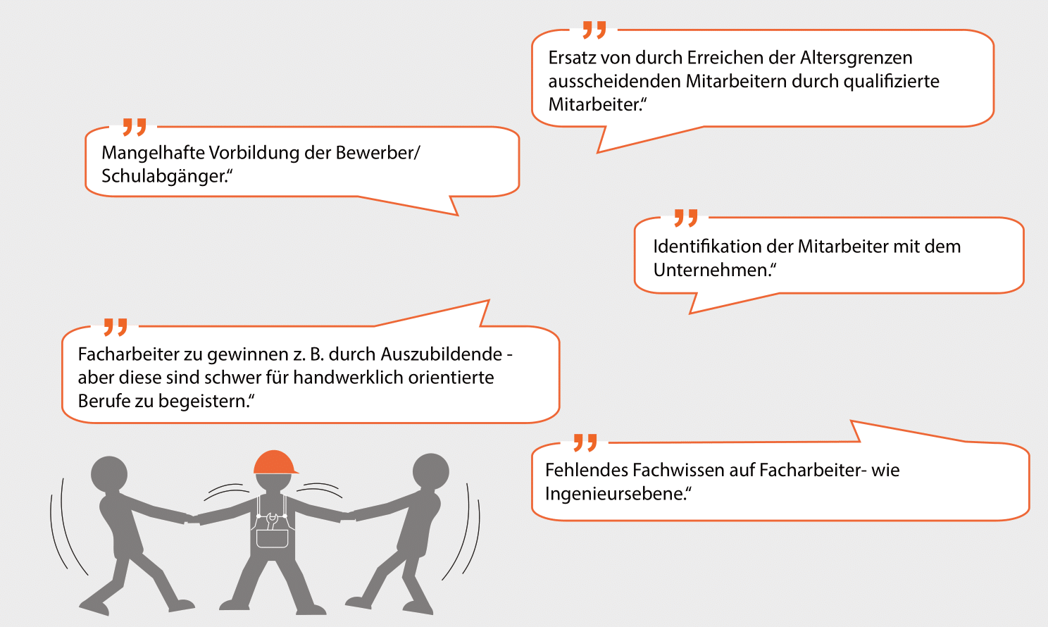 In den folgenden Charts geht die Studie gezielter auf die Top-Problemfelder und die im Kontext gefallenen Aussagen der Studienteilnehmer ein. In Bezug auf den Fachkräftemangel und der demografischen Entwicklung geben die Unternehmen einige Punkte an, die im Kontext bewältigt werden müssen. Zum einen findet der deutsche Mittelstand nicht ausreichend Nachwuchskräfte für freie Ausbildungsplätze. Laut der Studie sei die Steigerung der Arbeitgeberattraktivität durch gezielte Maßnahmen, wie Sie in diesem Blogbeitrag nachlesen können, allein nicht mehr ausreichend. Problem sei das zunehmend unzureichende Engagement der jungen Generation Z – insbesondere für Ausbildungsberufe in Handwerksunternehmen. Dies bestätigen zahlreiche andere Studien zur zunehmenden Akademisierung in Deutschland. Zum einen bleiben offene Ausbildungsstellen unbesetzt und zum anderen können Fachkräftelücken aufgrund der Alterung der Belegschaft nicht aufgefüllt werden. Das Problemfeld Generationenwechsel zu bewältigen, wird dadurch eine gravierende Hürde bis zum Jahr 2030, wenn die Generation Baby-Boomer den Arbeitsmarkt samt ihres wertvollen Fachwissens verlässt.