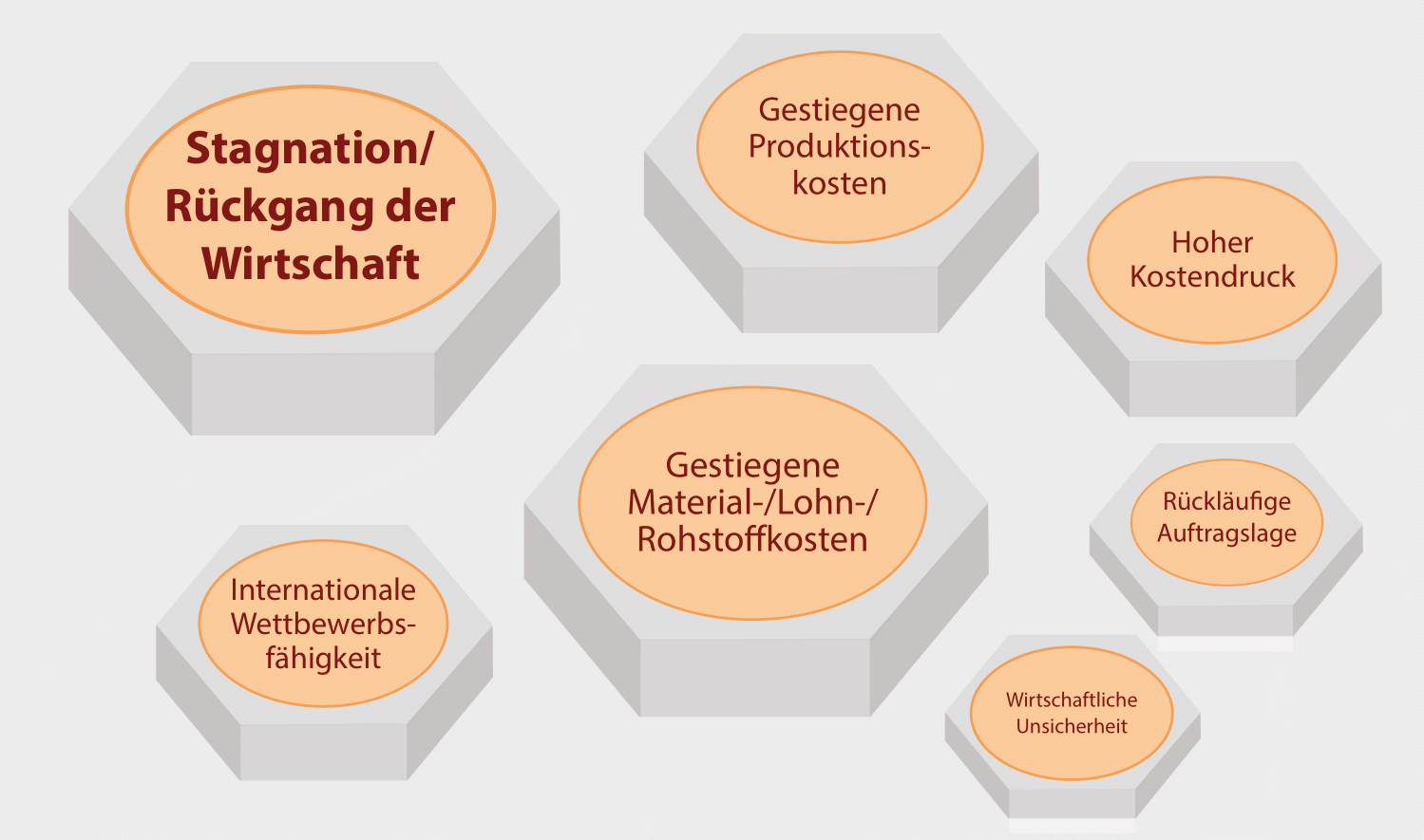 Im Kontext zum erhöhten Wettbewerbsdruck benennen die befragten Unternehmen einige Gründe. Aufgrund von allgemein gestiegenen Preisen sind ebenfalls Material- und Produktionskosten betroffen. Dadurch würden die Unternehmen ihre eigene Wettbewerbsfähigkeit als gefährdet ansehen. Besonders in Anbetracht von internationalen Playern wie China oder Billiglohnländern. Die gestiegenen Produktionskosten führen nicht nur zu einem hohen Kostendruck, sondern ebenfalls zu einer rückläufigen Auftragslage. Die hohen Zinsen mindern die Nachfrage und führen allgemein zu einem Rückgang der Wirtschaft, wodurch die Unsicherheit der mittelständischen Unternehmen weiter steigt.