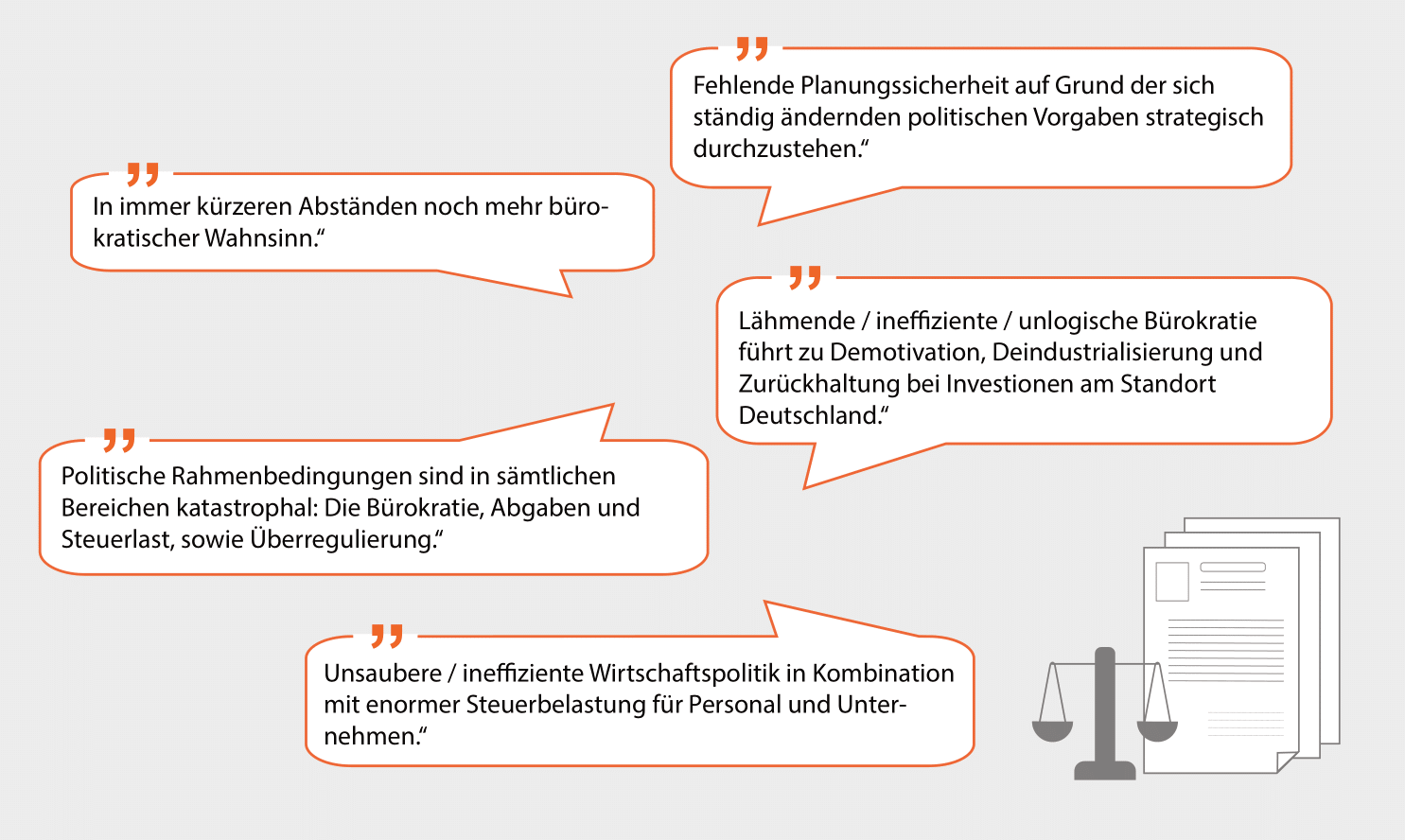 Die Politikverdrossenheit aufgrund von bürokratischen Auflagen wird auf dem letzten Chart erneut zum Ausdruck gebracht. Befragte Unternehmen kritisieren die fehlende Planungssicherheit aufgrund von sich ständig ändernden politischen Vorgaben, als auch notdürftige politische Rahmenbedingungen, die Investitionen zurückhalten. Dadurch wird der Standort Deutschland zunehmend unattraktiv für Unternehmer. Besonders mittelständische Unternehmen, welche 99,3% [1] sämtlicher Unternehmen in Deutschland ausmachen, zeigen sich mit den aktuellen bürokratischen Hindernissen unzufrieden. Die „bürokratische Überregulierung“ betrifft nicht nur die inländische Personalbeschaffung, sondern erschwert es auch, internationale Fachkräfte nach Deutschland zu holen.